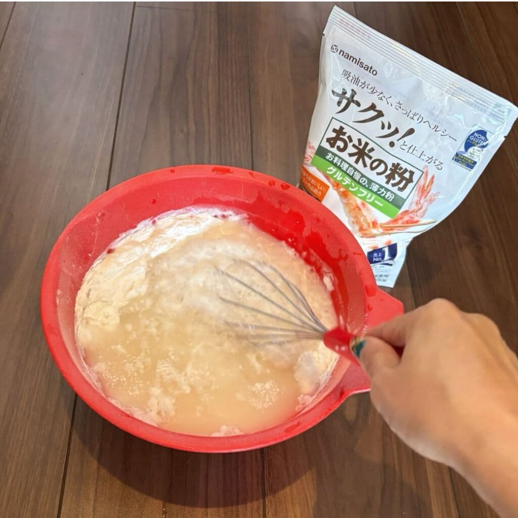 - 様子を見ながら米粉を少しずつ入れてかき混ぜる。