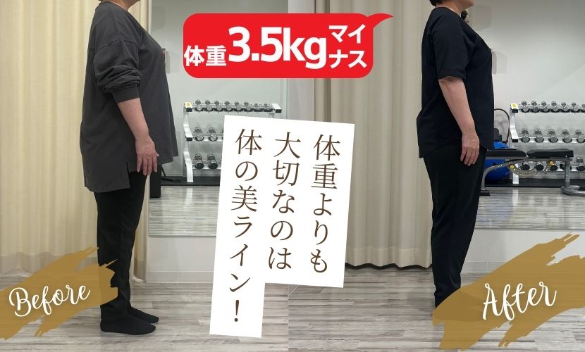 体重の数字だけ見れば3.5㎏の変化ではありますが、脂肪量をメインとした減量だと見た目の変化が大きく、マイナス10歳見え!数字に踊らされず、見た目の印象を大きく変える事に成功しています◎