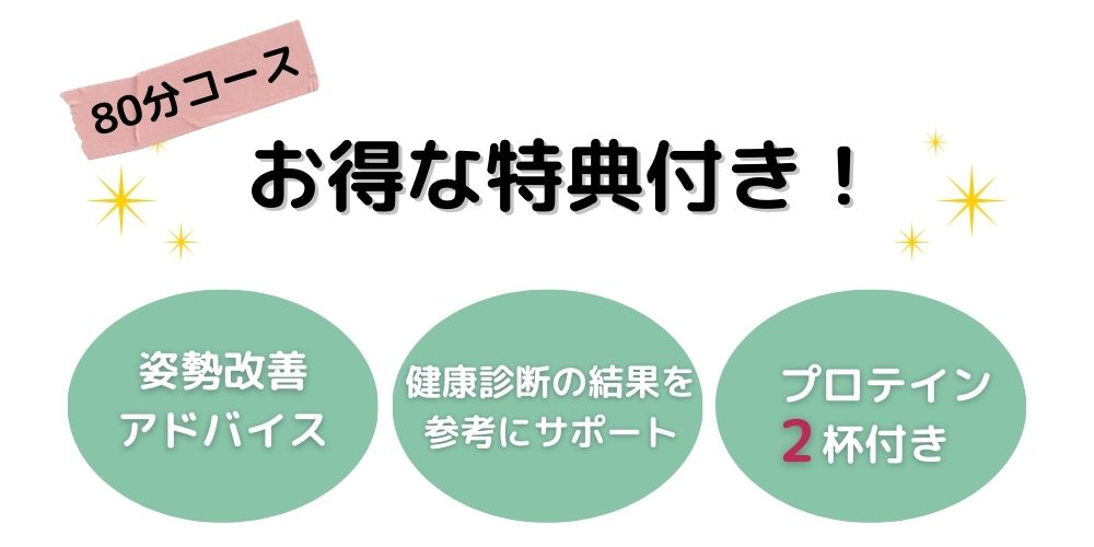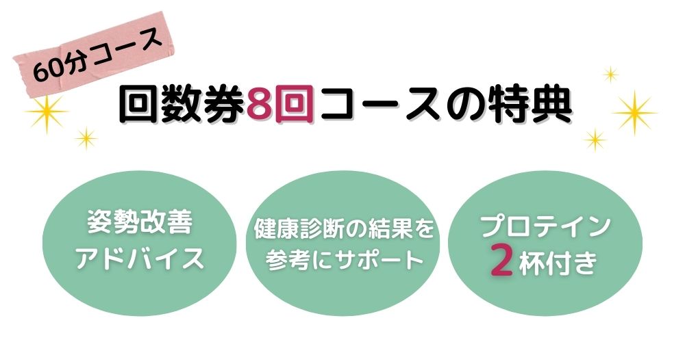 | 回数券 8回コース | 50,400円 (1回6,300円) | 39,200円 (1回4,900円) | ・姿勢改善 アドバイス ・健康診断結果を 参考にサポート ・プロテイン 2杯付き |