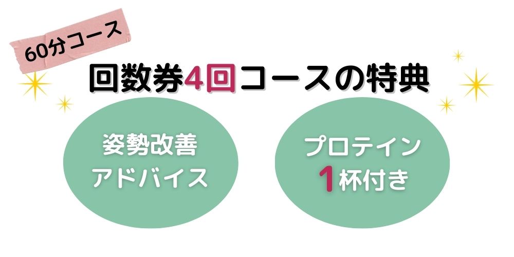 | 回数券 4回コース | 26,800円 (1回6,700円) | 21,200円 (1回5,300円) | ・姿勢改善 アドバイス ・プロテイン 1杯付き |